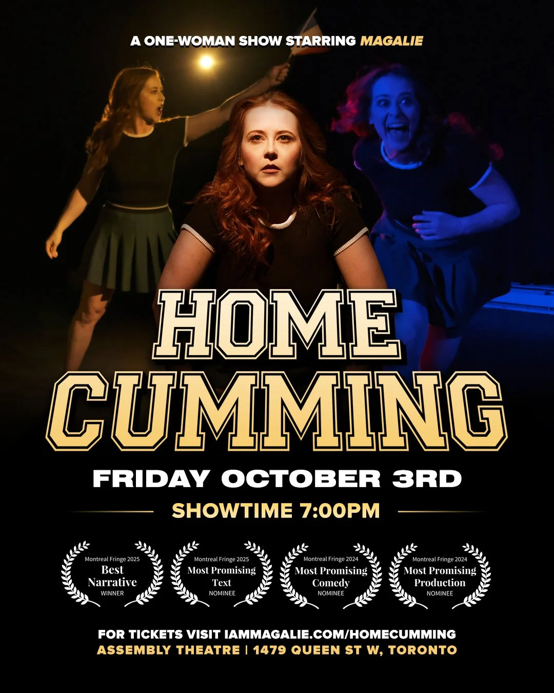 Homecumming was nominated for two Frankie awards at Montreal Fringe 2024 : “Most Promising Comedy” and “Most Promising Production”.